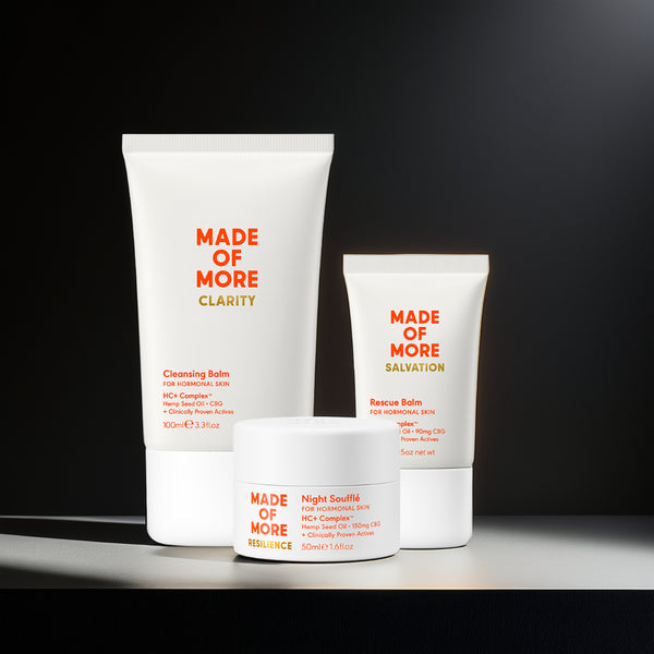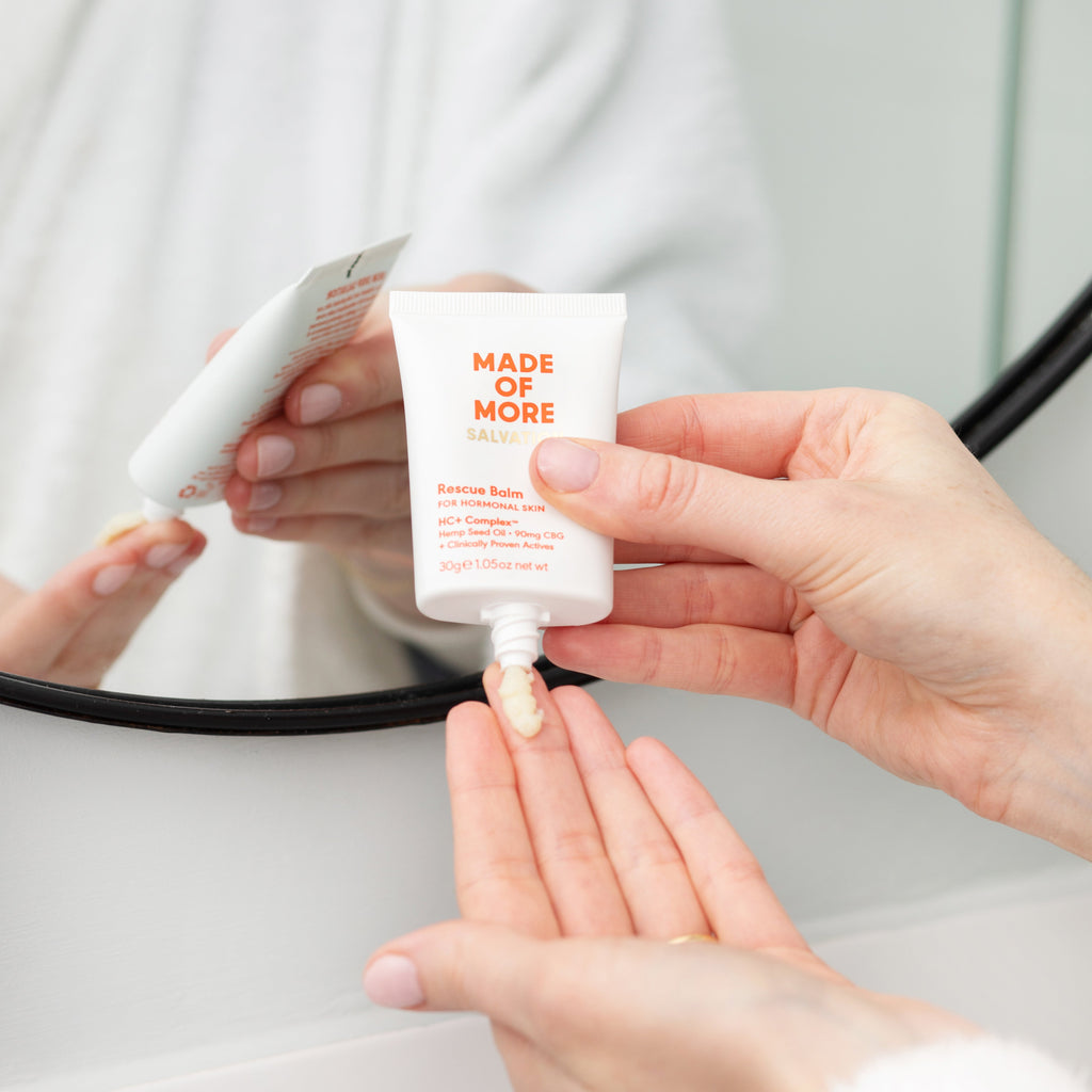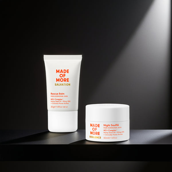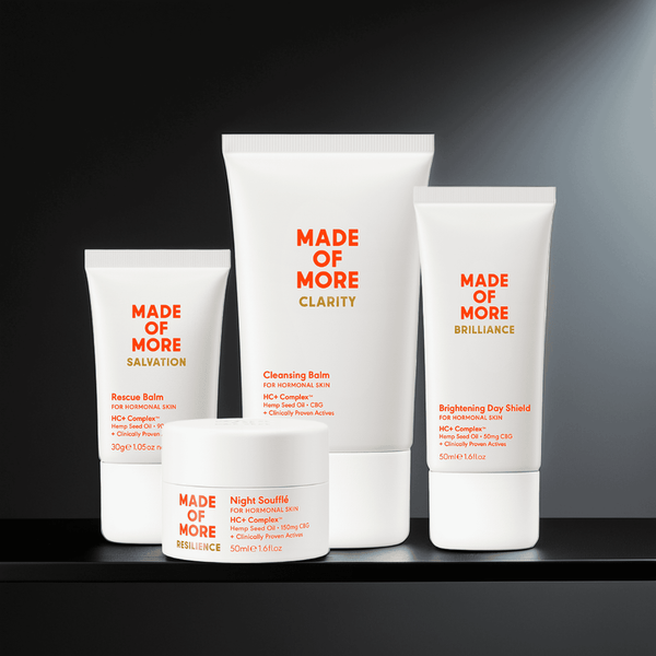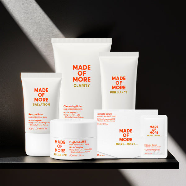 Our products combine British Hemp seed oil with CBG along with a potent blend of other clinical ingredients all designed to address the challenges of hormonal skin from 40 upwards. These ingredients work synergistically to tackle problem areas such as dull tired skin, collagen degradation, lack of sleep, fine lines, loss of skin tone and puffiness which are often combined with increased sensitivity and redness. Our complex works to support the skin during these times whilst avoiding some commonly known ingredients that can actually increase irritation at this time.