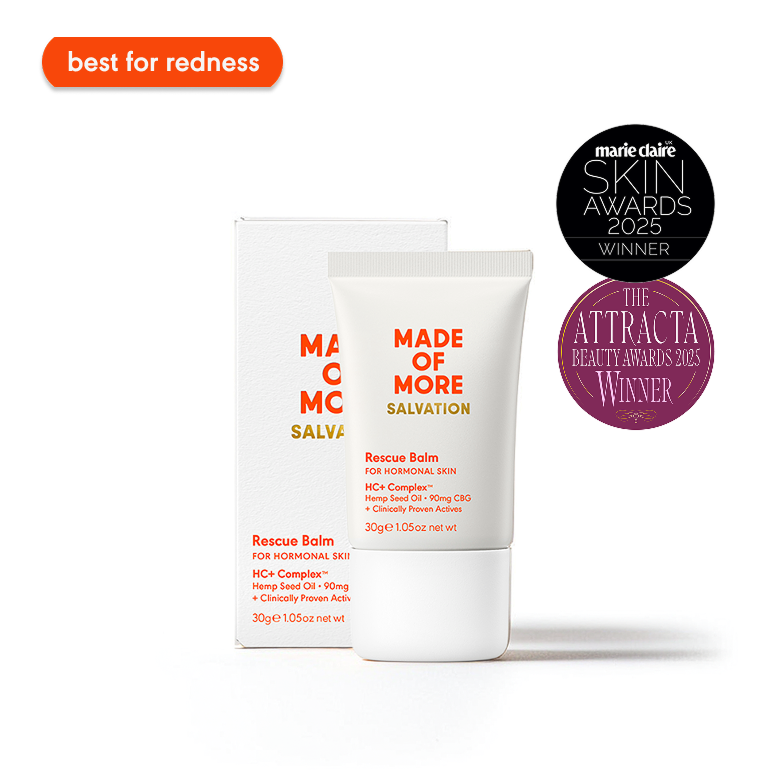 Menopausal flare-ups can strike anytime. This clinically formulated pocket-rocket intensive balm delivers 90mg stem-cell CBG to calm and comfort sore and dry skin, strengthen the barrier with ceramides, reduce visible redness, and gently blur away imperfections.