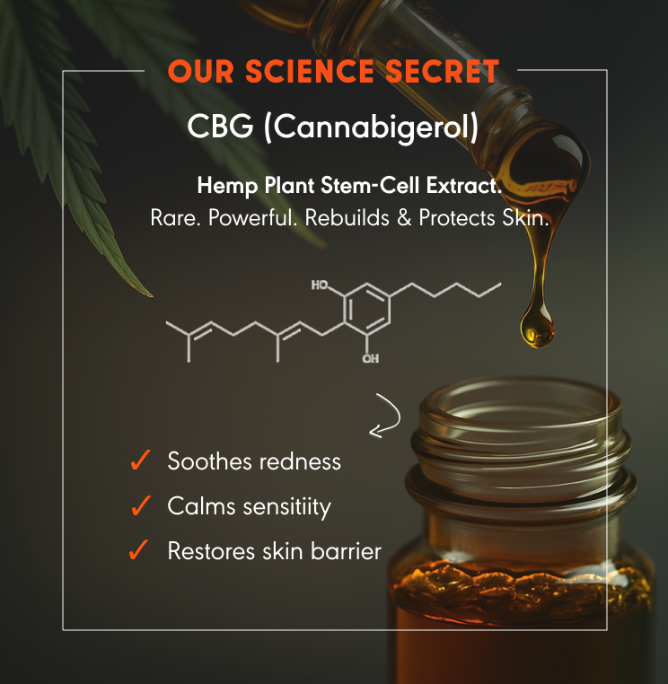 Our products combine British Hemp seed oil with CBG along with a potent blend of other clinical ingredients all designed to address the challenges of hormonal skin from 40 upwards. These ingredients work synergistically to tackle problem areas such as dull tired skin, collagen degradation, lack of sleep, fine lines, loss of skin tone and puffiness which are often combined with increased sensitivity and redness. Our complex works to support the skin during these times whilst avoiding some commonly known ingredients that can actually increase irritation at this time.